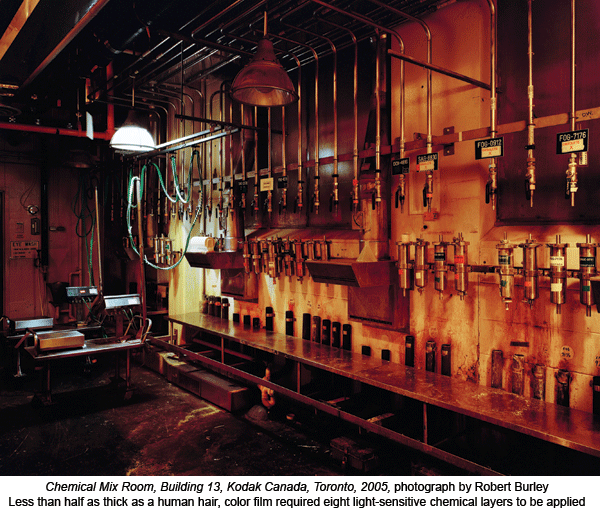 The most detailed portion of the book concerns Kodak Canada, a facility in Burley’s own back yard in Toronto. The plant closed in 2005, and Burley managed to get in immediately afterward. Cameras were never allowed behind what the workers referred to as “the silver curtain,” and it’s fascinating to get a glimpse into the former film hopper, where layer upon layer of light-sensitive chemicals used to be laid onto polyester film at punishingly high tolerances. As Burley writes, “After peering behind ‘the silver curtain,’ the phrase ‘economy of scale’ comes into sharp focus; it’s difficult to imagine how this process could ever be done successfully on a small scale.”
