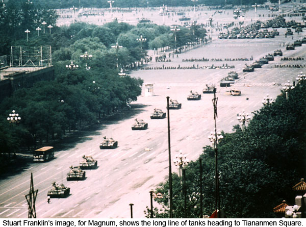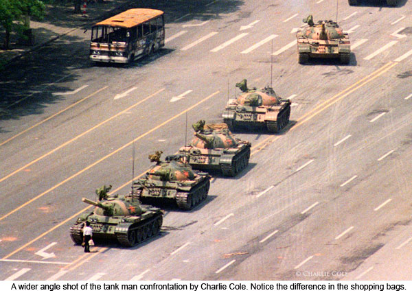 I had not seen the wide-angle Stuart Franklin image of “Tank man” before. It has reminded me of a question which came to me on first seeing the Jeff Widener photo, namely why did the following tanks not sweep around the blocked tank, and continue their progress across the Square of Heavenly Peace?
