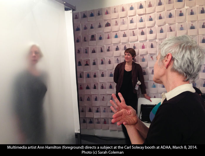 At the other end of the spectrum, “hot from the oven,” was the Carl Solway gallery booth. It doesn’t get hotter than this: the art was being made right on the spot. In this interactive piece, passersby could sign up to be photographed behind a sheet of heavy fogged plastic, while multimedia artist Ann Hamilton directed them to connect with the plastic in various ways.