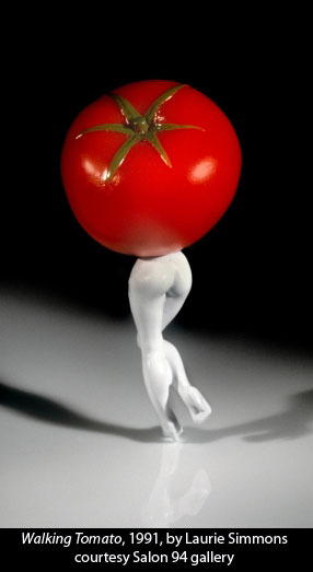 Finally, somewhere between “old wine” and “oven hot” was the exhibit at the Salon 94 gallery booth—a solo show by Laurie Simmons , who’s almost as famous for her eerie photographs of dolls as she is for being Lena Dunham ‘s mother. The current show featured some enormous photographs of toy objects—a toilet, a glove, a tomato—stuck onto porcelain figurine legs. And here’s where things became a bit weird. Our photo collecting teacher, the redoubtable Alice Sachs Zimet , is a stickler for knowing the exact date of a photographic print. But as she tried to get information on the Laurie Simmons prints from the pretty young gallery assistant, the conversation went something like this:
