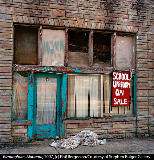 After reading that passage, look at any number of Bergerson’s images (the abandoned gas station, for example, or a forsaken storefront in Birmingham, Alabama with an old sign reading, “School Uniform on Sale” and a blanket-wrapped homeless body in front) and they may take on new levels of meaning.
