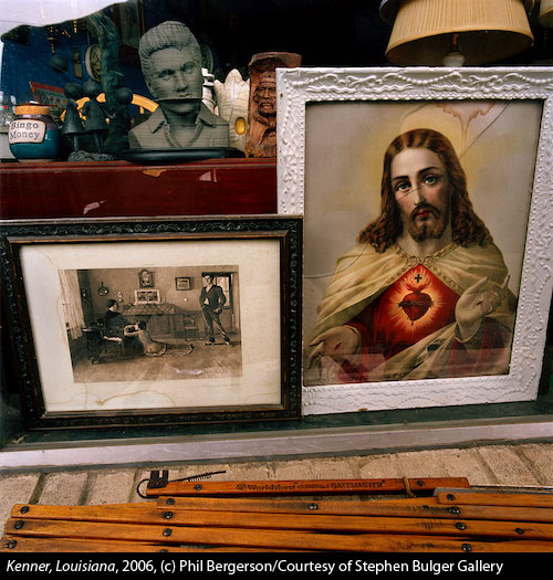 In addition to this focus on economics, Bergerson is very interested in religion. This chimes nicely with Atwood’s confession that, as a child of biologists, she was up to speed on sex but intensely ignorant and curious about the two other taboos, money and religion. In Bergerson’s case, his curiosity about how religion defines and divides American society leads him to capture many fascinating images, from sacred-heart Jesus figurines (one of which shares space with a bust of Elvis) to signs denouncing a local preacher to a wall spray-painted with the words, “Religion is the problem, not the answer.”
