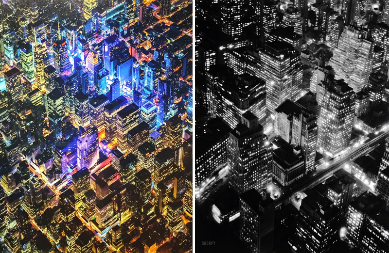 Vincent Laforet’s New York 1 (detail, left) clearly owed a debt to Berenice Abbott’s iconic Night View (right).