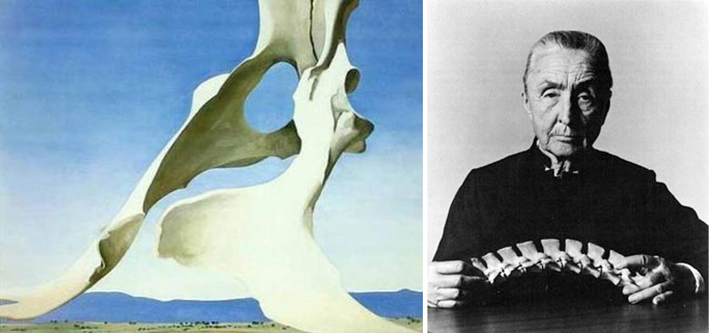 Pelvis with the Distance, 1943, by Georgia O’Keeffe (L); Portrait of Georgia O’Keeffe, photographer and date unknown, R